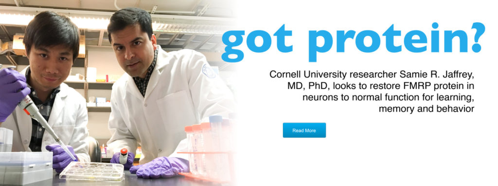 Which is the right FMRP for therapeutic development of Fragile X syndrome? When researchers develop effective drugs that reactivate FMRP — the protein that is normally silenced in Fragile X — what in the world will they do next? So ponders Cornell University researcher Samie R. Jaffrey, MD, PhD. Jaffrey, professor, Pharmacology, Weill Cornell Medical College, Cornell University, knows reactivating FMRP will lead to many important questions, such as: Which cell type needs FMRP? How much FMRP protein is needed to restore brain function? Where in the brain will FMRP protein be needed? Where in a neuron will the FMRP needs to be expressed?