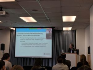 Dr. Erickson started the day off discussing Targeted Drug Treatment in Fragile X Syndrome: New Developments and Directions. He presented an impressive study comparing single doses of four different potential Fragile X treatments, showing that EEG has great promise as a potential outcome measure for future clinical trials. His current FRAXA funded AZD7325 clinical trial will be incorporating EEG test he spoke about. EEG is also the subject of Dr. Wilkinson’s current study in young children with Fragile X, which she discussed in the afternoon.