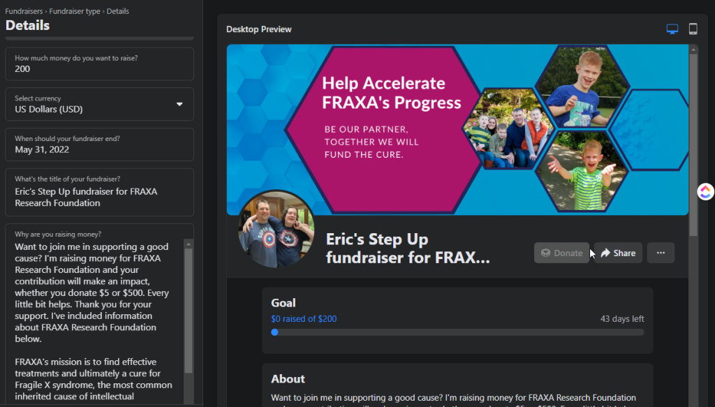The easiest way to host your Step Up for Fragile X Research fundraiser is on Facebook, simply set a goal and invite your friends and encourage them to Step Up for Fragile X!